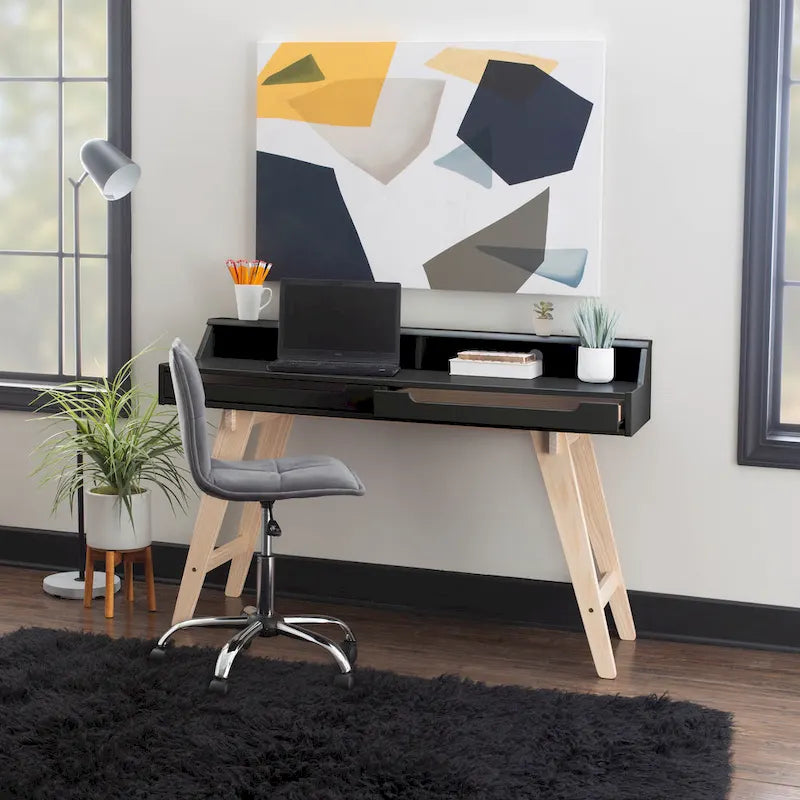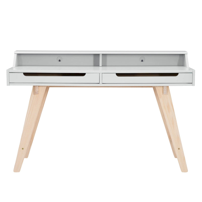 Designed for getting down to business, the wide top surface on this desk provides plenty of workspace. The attached hutch helps organize tasks and the dual drawers hold lots of supplies. Three desktop color choices beautifully reflect today's home fashion trends as does their contrast with a natural finish on the undercarriage and legs, which flare to further enhance the look. The desks complement a wide variety of room styles from mid-century modern to country.
